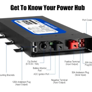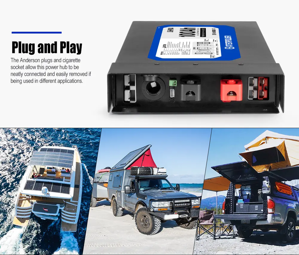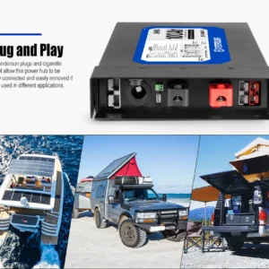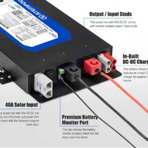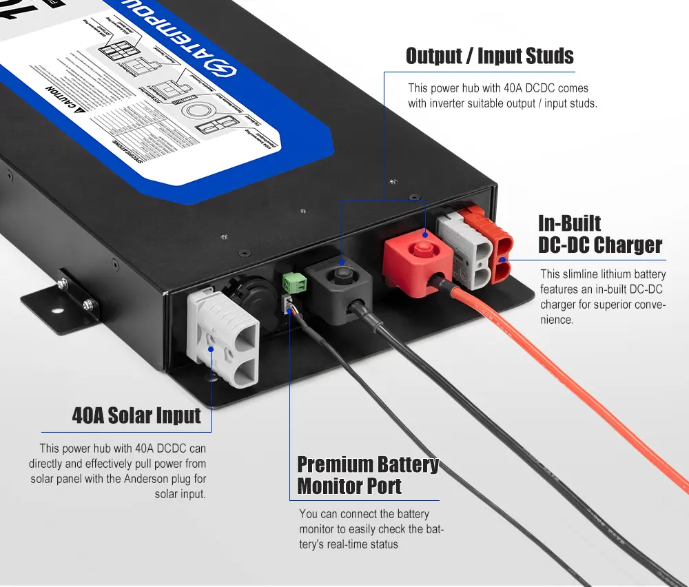 Integra cargador DC-DC de 40A, entrada solar y estructura metálica reforzada, reduciendo la complejidad de instalación y optimizando el espacio en configuraciones bajo asiento o compartimientos reducidos.
