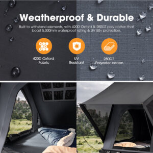 Carpa techo Kalbarri Lite ultraligera 61kg, perfil 116mm plegada. Interior 207x117cm, colchón viscoelástica 5cm, LED tricolor, impermeable 5000mm. Incluye barras de techo.