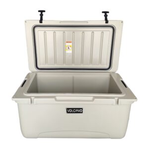 Cooler rotomoldeado VOLCANO RH65L de 65 litros. Resistencia extrema, conserva hielo por días. Incluye abridor, portavasos, regla de pesca y tapón de drenaje. Dimensiones: 80×47,5x45cm. Ideal para camping, pesca y expediciones.