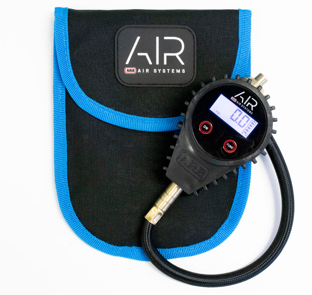 Desinflador digital ARB con pantalla LCD y capacidad 350psi. Construcción acero inoxidable, medidor Bourdon de bronce de alta precisión. Incluye funda de lona. Ideal para control preciso de neumáticos 4×4 en Chile.