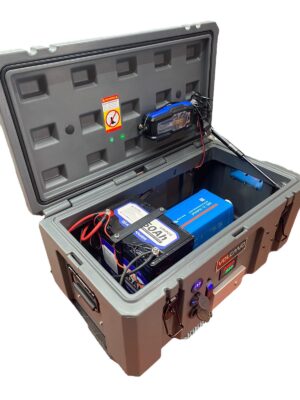 Estación energía portátil alta resistencia en caja rotomoldeada. Batería litio 50Ah Atempower, inversor Victron 500W, regulador MPPT Victron Bluetooth. Conectores Anderson 50A, salidas USB/12V/220V. Ideal para overland