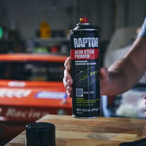 Promotor de adherencia Raptor® Acid Etch (RPTEP/AL) 450ml. Graba e imprimación en un solo paso sobre acero galvanizado, aluminio y metales desnudos. Boquilla de alta atomización, secado rápido (10-20 min) y no requiere lijado posterior. Excelente base anticorrosiva.