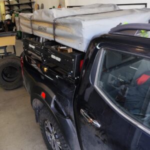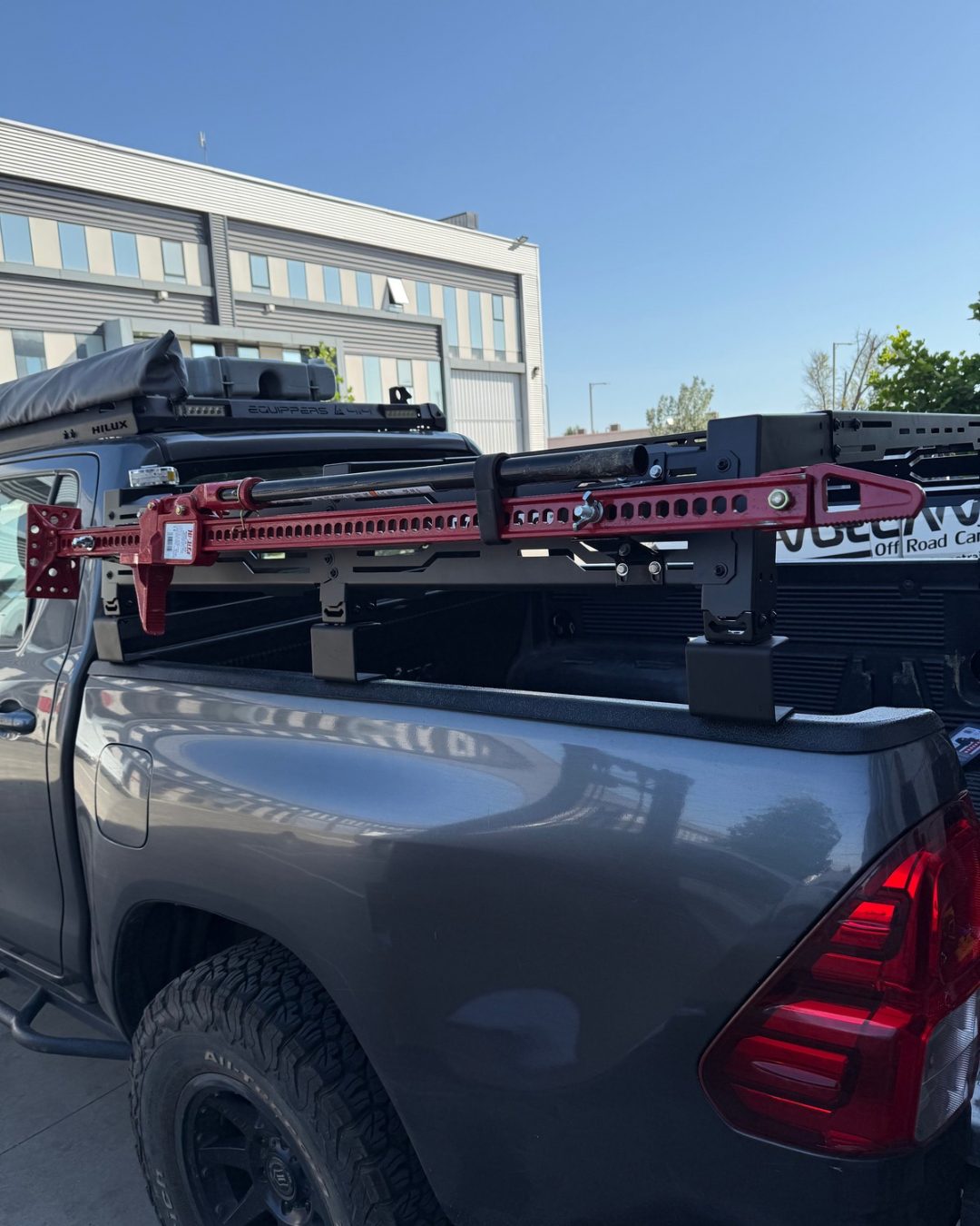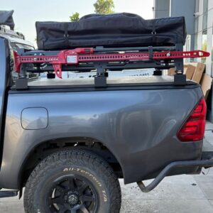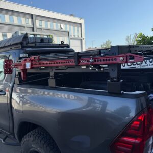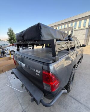 Rack universal ajustable para pickup VOLCANO (baja altura 28cm). Compatible con Hilux, Navara, L200 y más. Estructura acero 30kg, medidas 140x127cm. Ideal para carga, carpas de techo y trabajo.