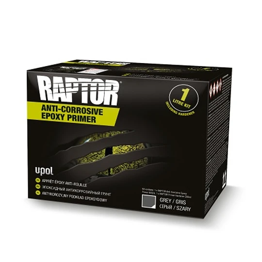 Primer Epoxi Anticorrosivo Raptor® 1L (REP/1LK) kit 2K. Diseñado como base para revestimiento RAPTOR. Resistencia a niebla salina >1000 h, aplicable sobre óxido superficial, excelente adherencia y lijado. Cobertura aprox. 6 m²/L.