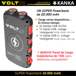 Llega más lejos y carga más rápido. El Super Powerbank VOLTIQ 20.000 mAh es la estación de energía portátil más completa, diseñada para alimentar múltiples dispositivos a la vez durante días. Con su novedosa carga inalámbrica de 15W y cuatro puertos de salida, es la solución definitiva para viajes, trabajo en terreno o tu kit de emergencia.
