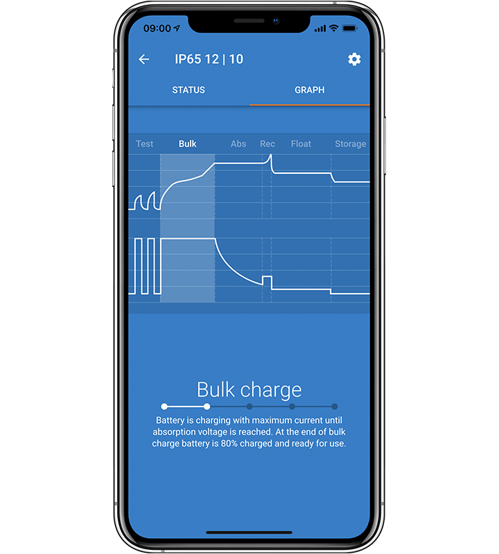 - Monitorización en Tiempo Real: Visualiza el voltaje, la corriente de carga, el estado de la batería y más, directamente desde tu smartphone o tablet con la app VictronConnect .